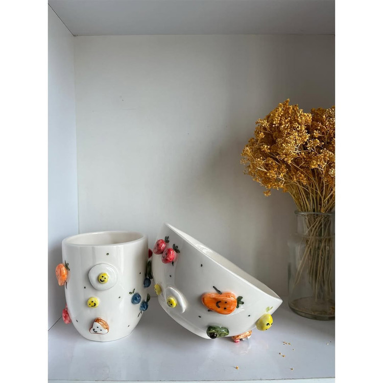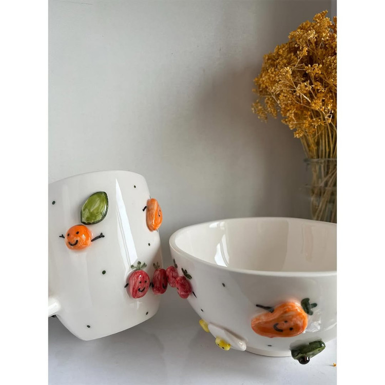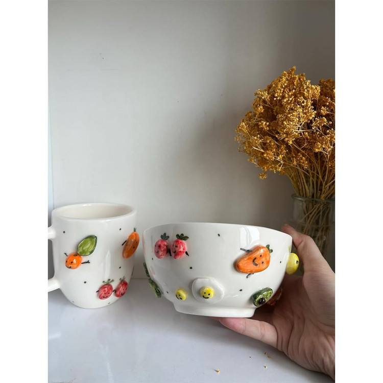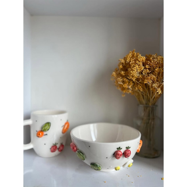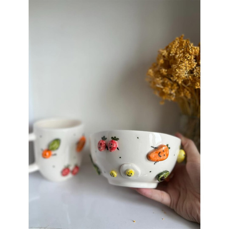 خب اینم کاسه و ماگ میوه ای که کنار بشقابش ترکیب خیلییی جذابی میسازه و من خودم عاشقشون شدم خوردن غذا و تنقلات تو این ظرفا واقعاا مزه بهشت میده ارسال بین ۱۵ الی ۲۵ روز کاری