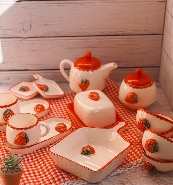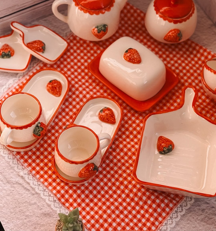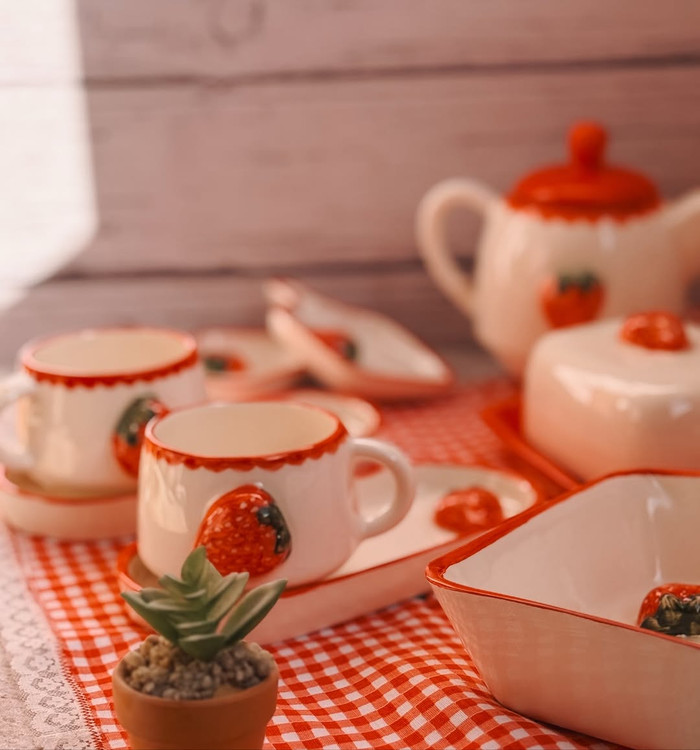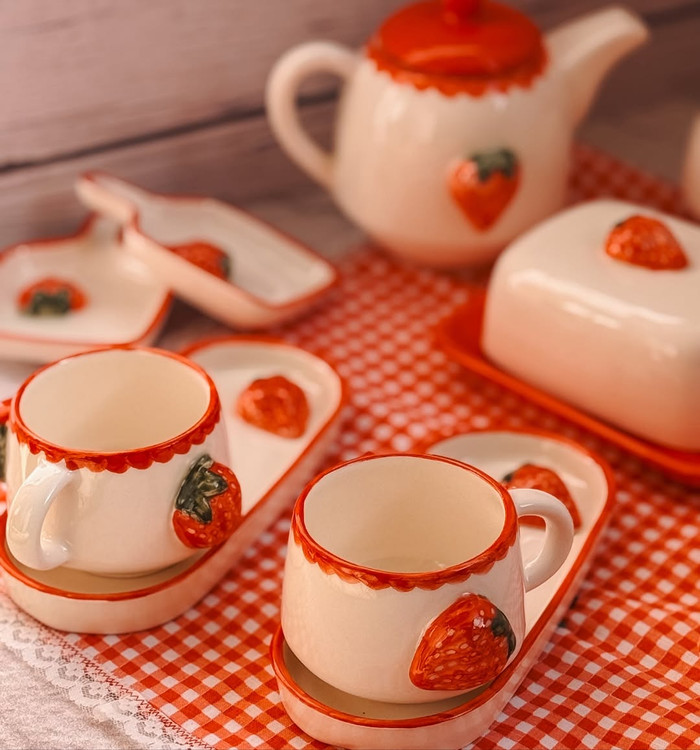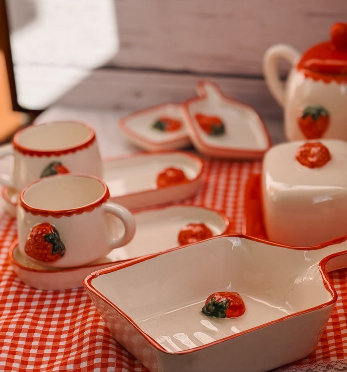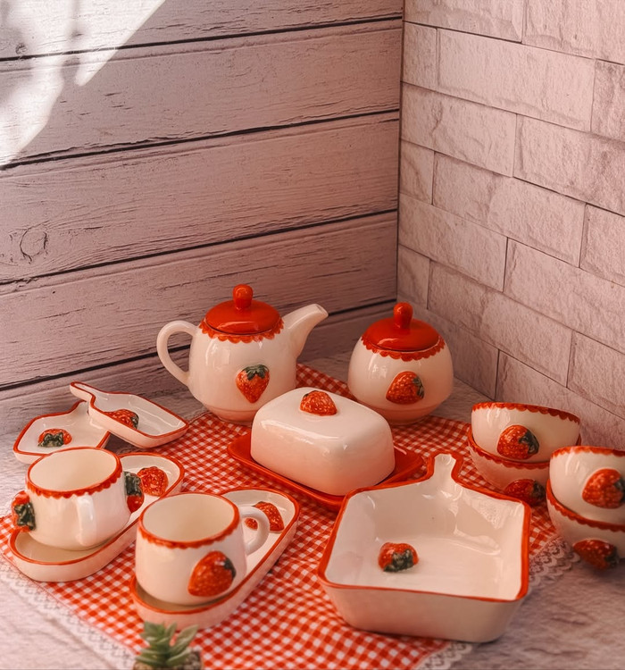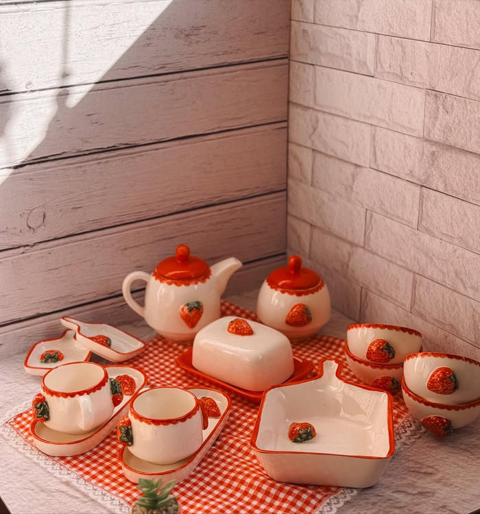 هر تیکه از این سرویس توتفرنگی یه حالِ خوب قشنگ با خودش داره… دستساز، خاص و درست همون رنگی که دل آدم رو گرم میکنه برای میزهایی که قرار نیست معمولی باشن.